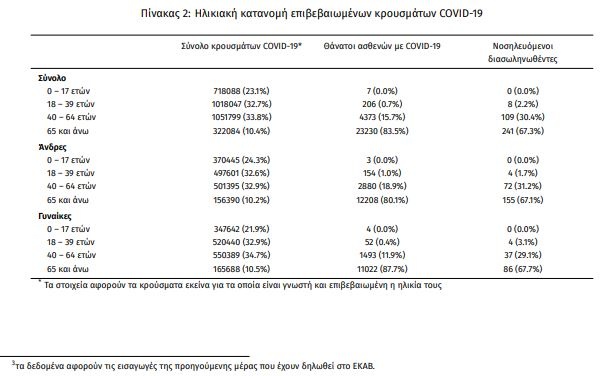 Οι νέοι θάνατοι ασθενών με COVID-19 είναι 70, ενώ από την έναρξη της επιδημίας έχουν καταγραφεί συνολικά 27.816 θάνατοι. Το 95.4% είχε υποκείμενο νόσημα ή/και ηλικία 70 ετών και άνω.