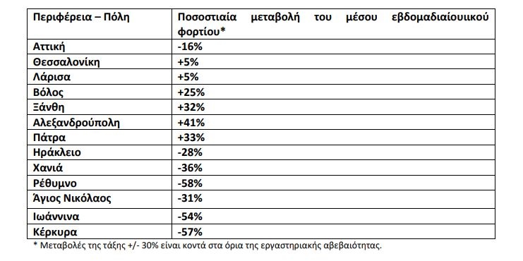 τις δεκατρείς (4/13) περιοχές που ελέγχθηκαν από το Εθνικό Δίκτυο Επιδημιολογίας Λυμάτων (ΕΔΕΛ) του ΕΟΔΥ, πτωτικές τάσεις σε επτά από τις δεκατρείς (7/13) περιοχές του ΕΔΕΛ και σταθεροποιητικές τάσεις σε δύο από τις δεκατρείς (2/13) περιοχές που ελέγχθηκαν από το ΕΔΕΛ. Καθαρά αυξητικές τάσεις παρατηρήθηκαν στην Ξάνθη (+32%), στην Πάτρα (+33%) και στην Αλεξανδρούπολη (+41%), ενώ οριακή ήταν η αύξηση στο Βόλο (+25%). Καθαρά πτωτικές τάσεις παρατηρήθηκαν στον Άγιο Νικόλαο (-31%), στα Χανιά (-36%), στα Ιωάννινα (-54%), στην Κέρκυρα (-57%) και στο Ρέθυμνο (-58%), ενώ οριακή ήταν η μείωση στην Περιφέρεια Αττικής (-16%) και στο Ηράκλειο (-28%). Το ιικό φορτίο των αστικών λυμάτων παρέμεινε ουσιαστικά σταθερό στην Θεσσαλονίκη (+5%) και στη Λάρισα (+5%).