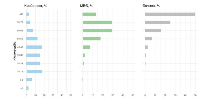 Οι εισαγωγές νέων ασθενών COVID-19 στα νοσοκομεία της επικράτειας είναι 313 (ημερήσια μεταβολή -4.57%). Ο μέσος όρος εισαγωγών του επταημέρου είναι 352 ασθενείς. Η διάμεση ηλικία των κρουσμάτων είναι 36 έτη (εύρος 0.2 έως 112 έτη), ενώ η διάμεση ηλικία των θανόντων είναι 79 έτη (εύρος 0.2 έως 106 έτη).
