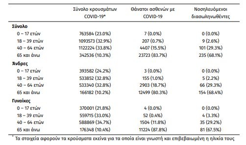 Οι νέοι θάνατοι ασθενών με COVID-19 είναι 65, ενώ από την έναρξη της επιδημίας έχουν καταγραφεί συνολικά 28.344 θάνατοι. Το 95.4% είχε υποκείμενο νόσημα ή/και ηλικία 70 ετών και άνω.
