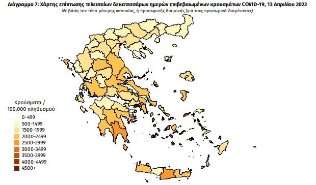 Γεωγραφική διασπορά: Ο χάρτης αποτυπώνει τη γεωγραφική κατανομή των κρουσμάτων COVID-19 των τελευταίων 14 ημερών ανά Περιφερειακή
