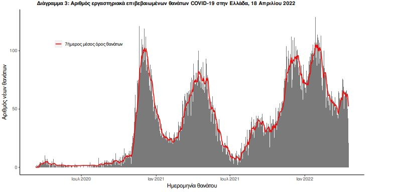 Στο Διάγραμμα 3 παρουσιάζεται η ημερήσια κατανομή των θανάτων και ο 7ήμερος κυλιόμενος μέσος όρος του αριθμού των θανάτων.