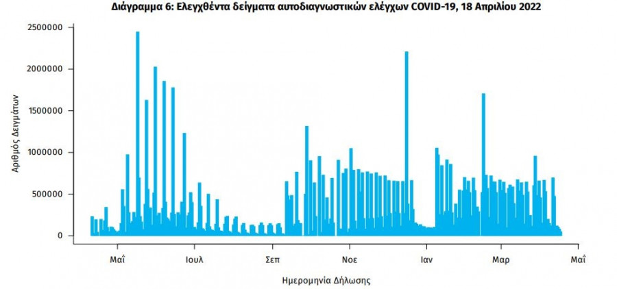 Αυτοδιαγνωστικοί έλεγχοι (Self-tests): Έως 17 Απριλίου 2022, έχουν καταγραφεί ηλεκτρονικά 105.899.959 δηλώσεις αποτελέσματος αυτοδιαγνωστικού ελέγχου,ενώ 6.395.029 άτομα προσήλθαν για επανέλεγχο.