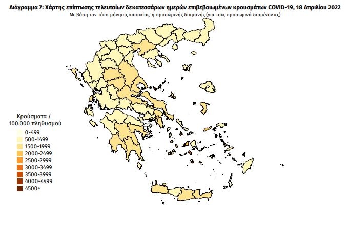 Ημερήσιος αριθμός και κρούσματα ανά 100.000 πληθυσμού επιβεβαιωμένων εγχώριων κρουσμάτων COVID-19 ανά περιφερειακή ενότητα στις 18 Απριλίου 2022.
