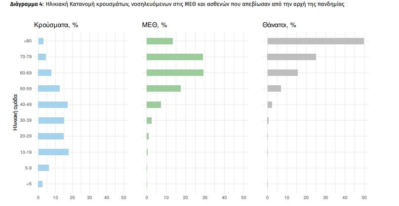 Ακολούθως παρουσιάζεται η ηλικιακή κατανομή των (α) συνολικών κρουσμάτων, (β) των περιστατικών που κατέληξαν σε θάνατο και (γ) των ασθενών που νοσηλεύονται διασωληνωμένοι: