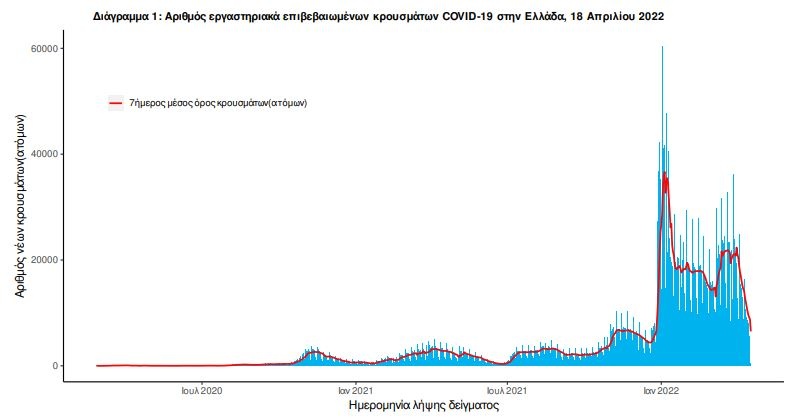 Στο Διάγραμμα 1 παρουσιάζεται η ημερήσια κατανομή των επιβεβαιωμένων κρουσμάτων(ατόμων) και ο 7ήμερος κυλιόμενος μέσος όρος του αριθμού των κρουσμάτων.