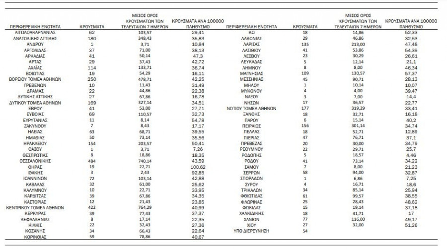 Γεωγραφική διασπορά: Ο χάρτης αποτυπώνει τη γεωγραφική κατανομή των κρουσμάτων COVID-19 των τελευταίων 14 ημερών ανά Περιφερειακή Ενότητα της χώρας, με βάση την δηλωθείσα διεύθυνση μόνιμης κατοικίας του ασθενούς, ή τη διεύθυνση προσωρινής διαμονής για τους τουρίστες και άλλους προσωρινά διαμένοντες στην Ελλάδα. Συμπεριλαμβάνονται τόσο κρούσματα με ιστορικό ταξιδίου (“εισαγόμενα”) όσο και κρούσματα με πιθανή εγχώρια μετάδοση.