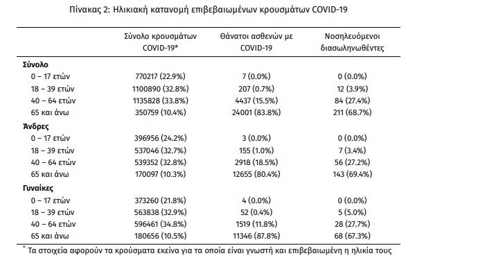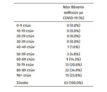 Οι νέοι θάνατοι ασθενών με COVID-19 είναι 63, ενώ από την έναρξη της επιδημίας έχουν καταγραφεί συνολικά 28.652 θάνατοι. Το 95.5% είχε υποκείμενο νόσημα ή/και ηλικία 70 ετών και άνω.