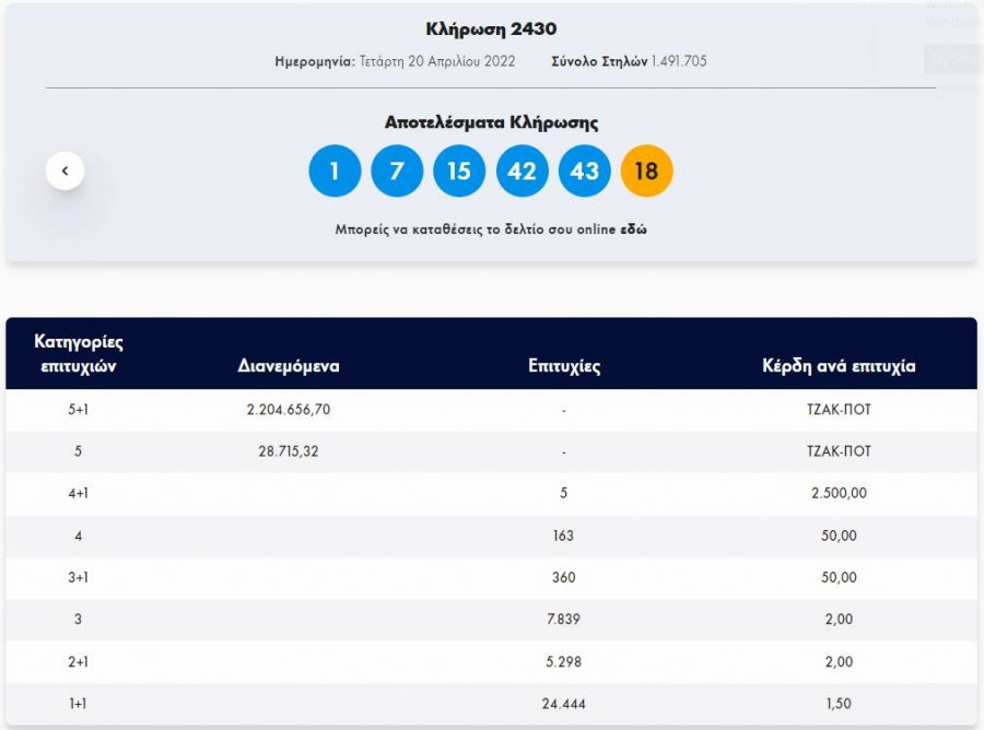 Οι τυχεροί αριθμοί της αποψινής κλήρωσης του Τζόκερ είναι οι: 1, 7, 15, 42, 43 και αριθμός Τζόκερ το 18.