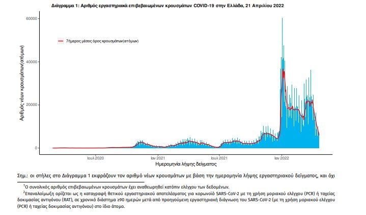 Στο Διάγραμμα 1 παρουσιάζεται η ημερήσια κατανομή των επιβεβαιωμένων κρουσμάτων(ατόμων) και ο 7ήμερος κυλιόμενος μέσος όρος του αριθμού των κρουσμάτων