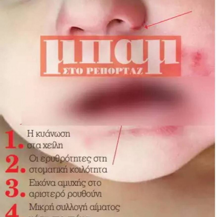 - Μέσα στο στόμα του βρέφους, σύμφωνα με το δημοσίευμα, παρατηρείται εικόνα μικρής συλλογής αίματος προφανώς οφειλόμενη στη βίαιη είσοδο του πανιού εντός της στοματικής κοιλότητας κατά τη στιγμή της απόφραξης των έξω στομίων των αεροφόρων οδών.