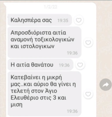 Στις 30 Ιανουαρίου του 2022, μια μέρα μετά τον θάνατο της κόρης της, η Ρούλα Πισπιρίγκου έστελνε μηνύματα σε γιατρούς στην Πάτρα. Σε αυτά φαίνεται να μιλά με πολύ μεγάλη ψυχρότητα και απάθεια για ιστολογικές και τοξικολογικές εξετάσεις στην κόρη της και τι μπορούν αυτές να αναδείξουν.