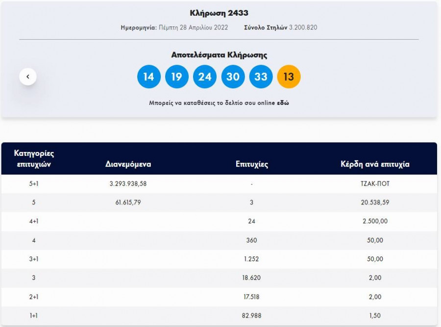 Οι τυχεροί αριθμοί της αποψινής κλήρωσης του Τζόκερ είναι οι: 14, 19, 24, 30, 33 και αριθμός Τζόκερ το 13.