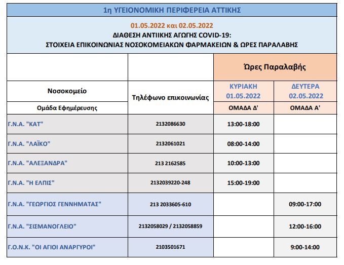 «Το Υπουργείο Υγείας, με την αμέριστη υποστήριξη των νοσοκομειακών φαρμακοποιών έχει μεριμνήσει για την απρόσκοπτη πρόσβαση των ασθενών με Covid-19 στις θεραπείες αντιικών χαπιών τις ημέρες των αργιών - εφόσον αυτό κρίνεται αναγκαίο από το γιατρό τους. Η προμήθεια των αντιικών θα γίνεται από τα φαρμακεία των Νοσοκομείων του Ε.Σ.Υ. για τις ημέρες Κυριακή 01/05/2022 και Δευτέρα 02/05/2022.