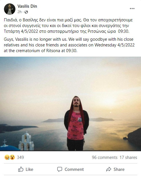 Συγγενείς και φίλοι του έχουν γράψει ένα σπαρακτικό μήνυμα για τον χαμό του στον λογαριασμό του στο Facebook όπου αναφέρουν στα ελληνικά και τα αγγλικά ότι: