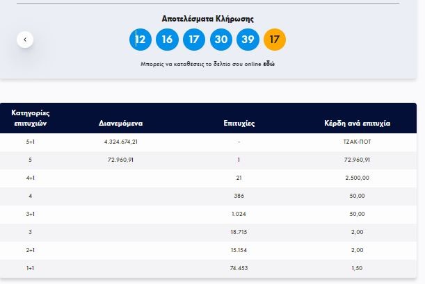 Οι τυχεροί αριθμοί της αποψινής κλήρωσης του Τζόκερ είναι οι: 12, 16, 17, 30, 39 και αριθμός Τζόκερ το 17.
