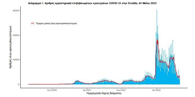 Τα στοιχεία που παρουσιάζονται αφορούν περιστατικά από την επιδημιολογική επιτήρηση της νόσου από το νέο κορωνοϊό (COVID-19), με βάση τα δεδομένα που έχουν δηλωθεί στον ΕΟΔΥ και καταγραφεί μέχρι τις 04 Μαΐου 2022 (ώρα 09:00).