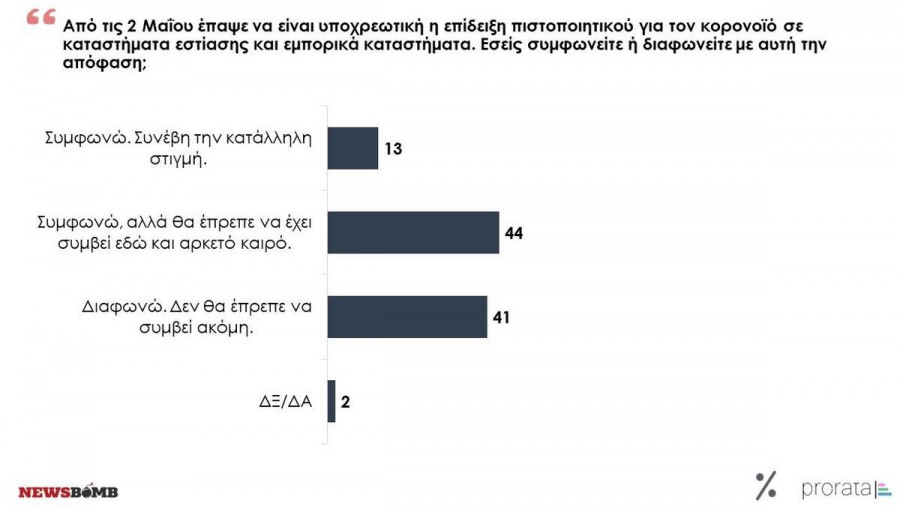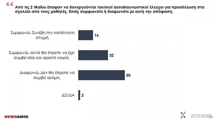 Παρά την επιμονή του ιού, φαίνεται πως η κανονικοποίηση της πανδημίας σε συνδυασμό με την κόπωση που προκύπτει από τους περιορισμούς έχει οδηγήσει σημαντική μερίδα της κοινωνίας σε μια στάση αρνητική ως προς τη διατήρηση μέτρων που μια προηγούμενη περίοδο φάνταζαν απαραίτητα. Ο παραπάνω ισχυρισμός βέβαια δεν αφορά το σύνολο των πολιτών, αλλά μια εξαιρετικά ορατή μερίδα αυτών. Το 57% θεωρεί ότι καλώς - αν και μάλλον καθυστερημένα - αποφασίστηκε η άρση της υποχρέωσης επίδειξης πιστοποιητικού σε καταστήματα, ενώ απόλυτα μοιρασμένη μοιάζει η κοινή γνώμη ως προς την απόφαση για παύση των αυτοδιαγνωστικών τεστ στα σχολεία, με το 48% να συμφωνεί και το 50% να διαφωνεί με την νέα εφαρμοζόμενη πολιτική.