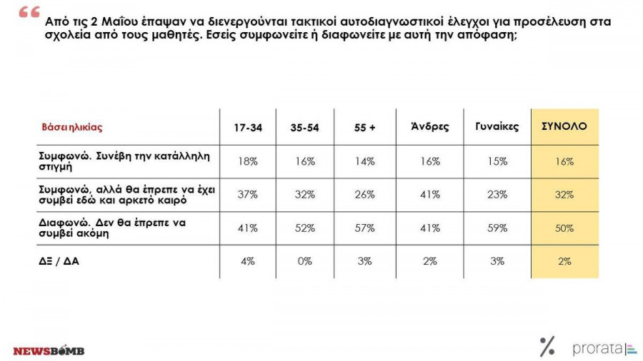 Πέρα, ωστόσο, από τη γενική εικόνα διχοτόμησης των απόψεων επί της άρσης ή μη των περιορισμών ανιχνεύονται και ενδιαφέρουσες ειδικότερες διαφοροποιήσεις. Οι γυναίκες, τα άτομα μεγαλύτερης ηλικίας και όσοι αυτοτοποθετούνται στο κέντρο, τα κεντροαριστερά και τα αριστερά του πολιτικού φάσματος μοιάζουν σημαντικά πιο διστακτικοί ως προς την παύση των περιοριστικών μέτρων. Οι πολίτες μάλιστα άνω των 55 ετών, η πιο ευάλωτη απέναντι στον ιό δηλαδή ηλικιακή ομάδα, είναι οι μόνοι που με σαφώς πλειοψηφικούς όρους διαφωνούν και με την παύση επίδειξης πιστοποιητικού αλλά και της διενέργειας self - test στα σχολεία. Αντίθετα, οι νεότεροι άνθρωποι βιώνουν σαφώς πιο αρνητικά τους περιορισμούς, είτε γιατί αισθάνονται περισσότερο ανθεκτικοί απέναντι στον ιό, είτε επειδή η πανδημία έχει περιορίσει για δύο και πλέον χρόνια σημαντικές όψεις της - παραδοσιακά εντονότερης συγκριτικά με τις υπόλοιπες ηλικιακές κατηγορίες - κοινωνικής τους ζωής.