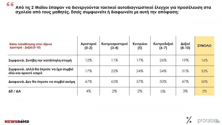 Εντούτοις, η παρούσα έρευνα αποκαλύπτει και μια σημαντική μεταβολή στις στάσεις των πολιτών απέναντι στους περιορισμούς, η οποία συσχετίζεται με τον πολιτικό αυτοπροσδιορισμό του καθενός και της καθεμιάς. Ενώ, όλη την προηγούμενη περίοδο, υπήρχε μια πολιτικά οριζόντια συμφωνία ότι τα περισσότερα μέτρα είναι απαραίτητο να διατηρηθούν, πλέον η εικόνα έχει ανατραπεί: Αυτοί που προσλαμβάνουν εντονότερα τον κίνδυνο της πανδημίας, εκτιμώντας πως η ώρα για άρση των περιορισμών δεν έχει φτάσει ακόμα είναι σαφώς περισσότεροι μεταξύ των αριστερών, κεντροαριστερών πολιτών και σαφώς λιγότεροι μεταξύ των κεντροδεξιών και δεξιών πολιτών. Με άλλα λόγια, το στοιχείο της επαγρύπνησης είναι σαφώς πιο ορατό μεταξύ των μη δεξιών πολιτών και σημαντικά ασθενέστερο μεταξύ των κεντροδεξιών και δεξιών. Ενδεικτικά, μεταξύ όσων αυτοπροσδιορίζονται ως αριστεροί ή κεντροαριστεροί το ύψος της απόρριψης της απόφασης για παύση των self - test από τους μαθητές/τριες φτάνει το 67%, ενώ μεταξύ όσων αυτοπροσδιορίζονται ως κεντροδεξιοί ή δεξιοί κυμαίνεται στο 47% έως 50%.