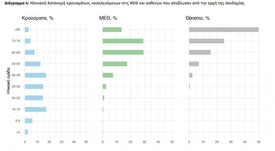 Οι εισαγωγές νέων ασθενών COVID-19 στα νοσοκομεία της επικράτειας είναι 120 (ημερήσια μεταβολή -19.46%). Ο μέσος όρος εισαγωγών του επταημέρου είναι 137 ασθενείς.Η διάμεση ηλικία των κρουσμάτων είναι 36 έτη (εύρος 0.2 έως 112 έτη), ενώ η διάμεση ηλικία των θανόντων είναι 79 έτη (εύρος 0.2 έως 106 έτη)