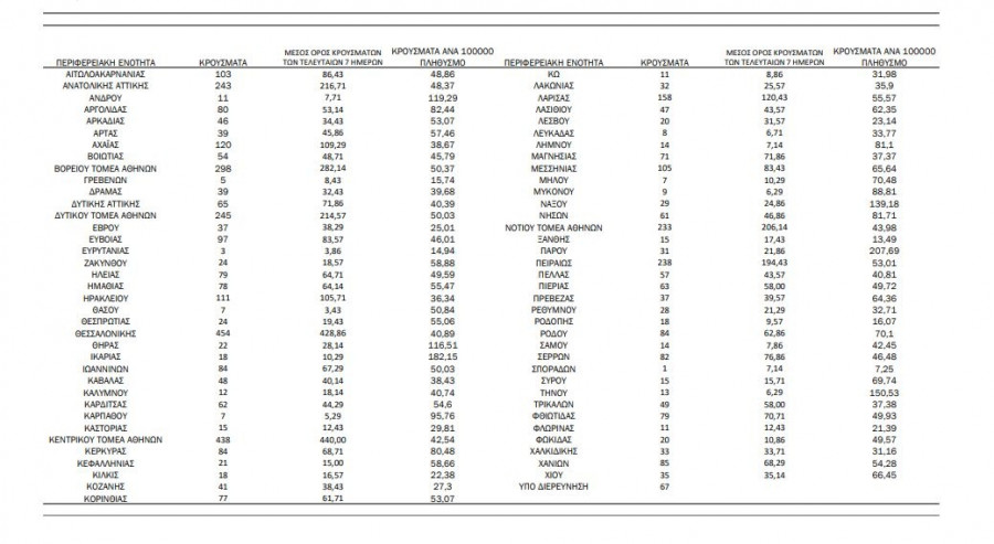 Κατανομή ανακοινωθέντων εγχώριων κρουσμάτων: Από το σύνολο των 5.092 νέων κρουσμάτων του νέου ιού στη χώρα 3 είναι εισαγόμενα. Η κατανομή των 5.089 νέων εγχώριων κρουσμάτων ανά Περιφερειακή Ενότητα παρουσιάζεται στον κατωτέρω πίνακα.