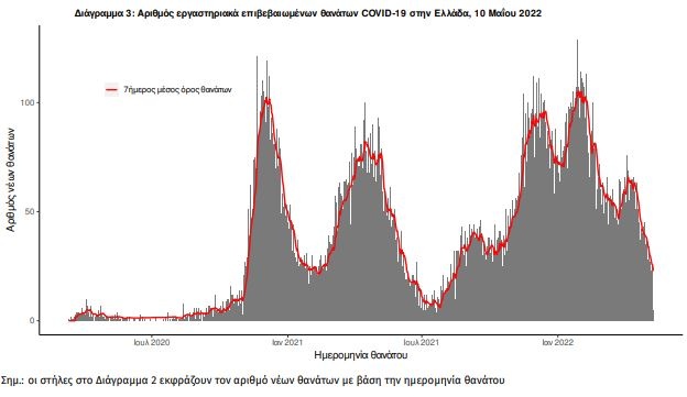 Στο Διάγραμμα 3 παρουσιάζεται η ημερήσια κατανομή των θανάτων και ο 7ήμερος κυλιόμενος μέσος όρος του αριθμού των θανάτων.