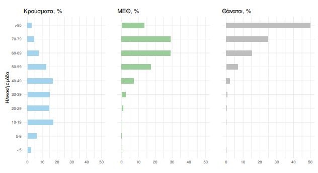 Ακολούθως παρουσιάζεται η ηλικιακή κατανομή των (α) συνολικών κρουσμάτων, (β) των περιστατικών που κατέληξαν σε θάνατο και (γ) των ασθενών που νοσηλεύονται διασωληνωμένοι: