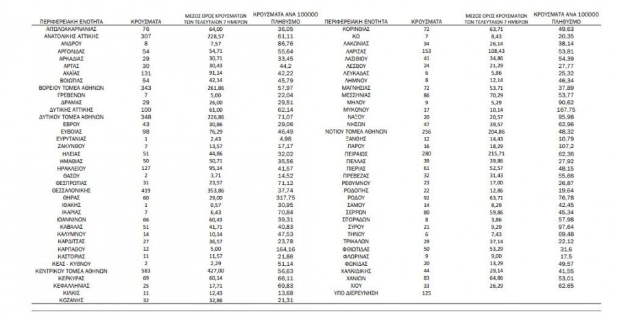 Κατανομή ανακοινωθέντων εγχώριων κρουσμάτων: Από το σύνολο των 5.268 νέων κρουσμάτων του νέου ιού στη χώρα 1 είναι εισαγόμενα. Η κατανομή των 5.267 νέων εγχώριων κρουσμάτων ανά Περιφερειακή Ενότητα παρουσιάζεται στον κατωτέρω πίνακα.
