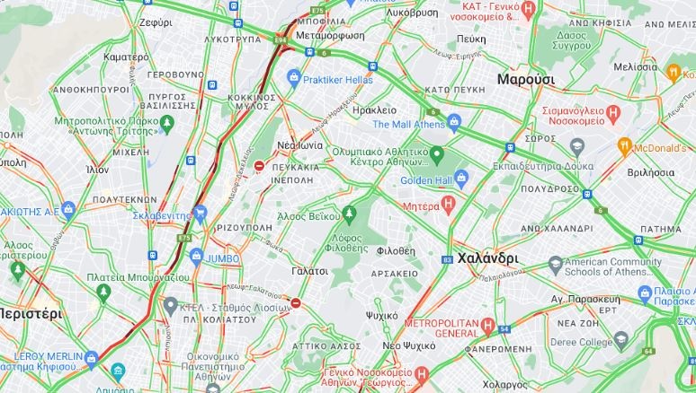 Δύσκολη για τους οδηγούς η κίνηση και στην κάθοδο της Κηφισίας, στην κάθοδο της Μεσογείων αλλά και στον Καρέα στο ρεύμα προς Κατεχάκη.