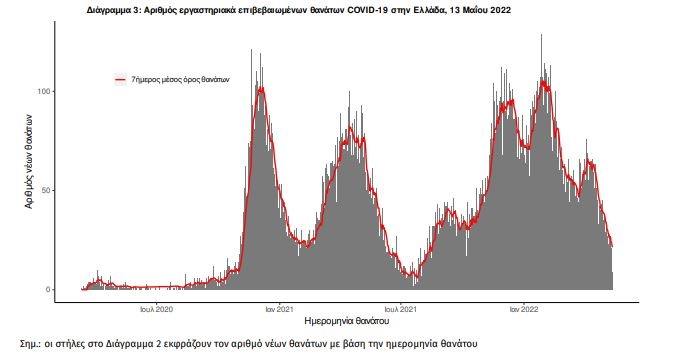 Στο Διάγραμμα 3 παρουσιάζεται η ημερήσια κατανομή των θανάτων και ο 7ήμερος κυλιόμενος μέσος όρος του αριθμού των θανάτων.