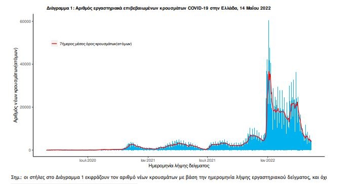 Στο Διάγραμμα 1 παρουσιάζεται η ημερήσια κατανομή των επιβεβαιωμένων κρουσμάτων(ατόμων) και ο 7ήμερος κυλιόμενος μέσος όρος του αριθμού των κρουσμάτων.