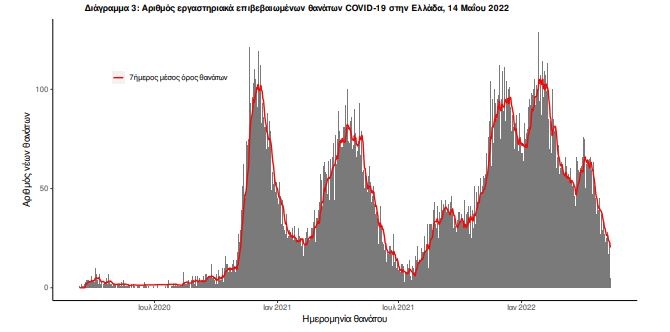 Στο Διάγραμμα 3 παρουσιάζεται η ημερήσια κατανομή των θανάτων και ο 7ήμερος κυλιόμενος μέσος όρος του αριθμού των θανάτων.