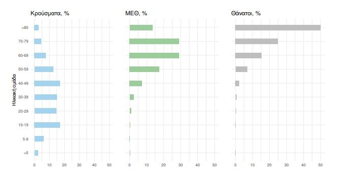 Διάγραμμα 4: Ηλικιακή Κατανομή κρουσμάτων, νοσηλευόμενων στις MEΘ και ασθενών που απεβίωσαν από την αρχή της πανδημίας