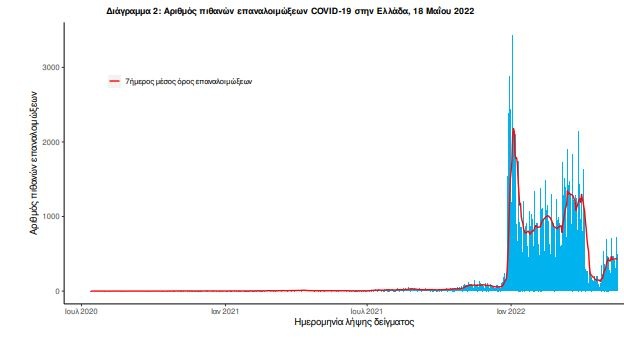 Ο αριθμός πιθανών νέων επαναλοιμώξεων που καταγράφηκαν τις τελευταίες 24 ώρες ήταν 494 ενώ από την αρχή της πανδημίας SARS-CoV-2 ο συνολικός αριθμός εκτιμάται σε 130.499(3.7% του συνολικού αριθμού των θετικών αποτελεσμάτων).