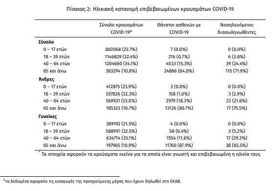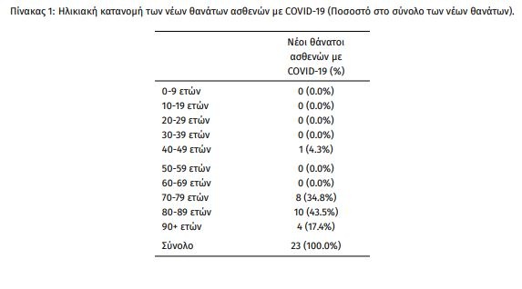 Οι νέοι θάνατοι ασθενών με COVID-19 είναι 23, ενώ από την έναρξη της επιδημίας έχουν καταγραφεί συνολικά 29.642 θάνατοι. Το 95.6% είχε υποκείμενο νόσημα ή/και ηλικία 70 ετών και άνω.