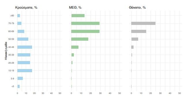 Ακολούθως παρουσιάζεται η ηλικιακή κατανομή των (α) συνολικών κρουσμάτων, (β) των περιστατικών που κατέληξαν σε θάνατο και (γ) των ασθενών που νοσηλεύονται διασωληνωμένοι: