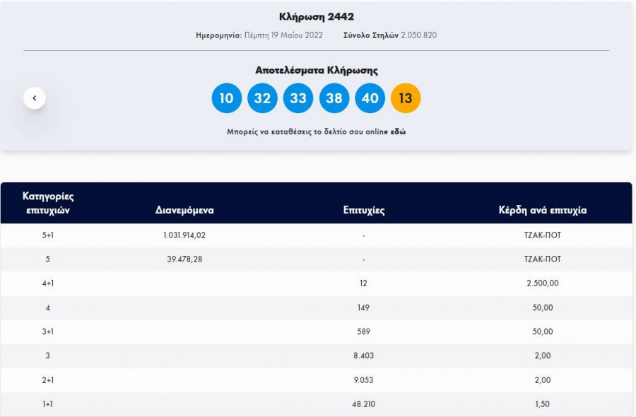 Οι τυχεροί αριθμοί της αποψινής κλήρωσης του Τζόκερ είναι οι: 10, 32, 33, 38, 40 και αριθμός Τζόκερ το 13.
