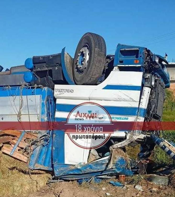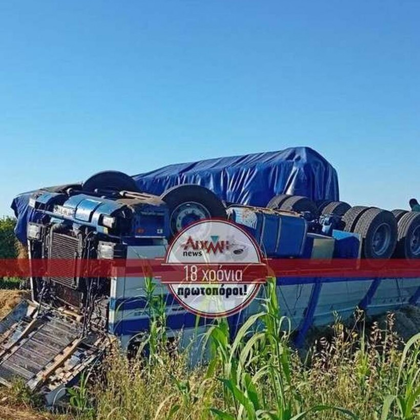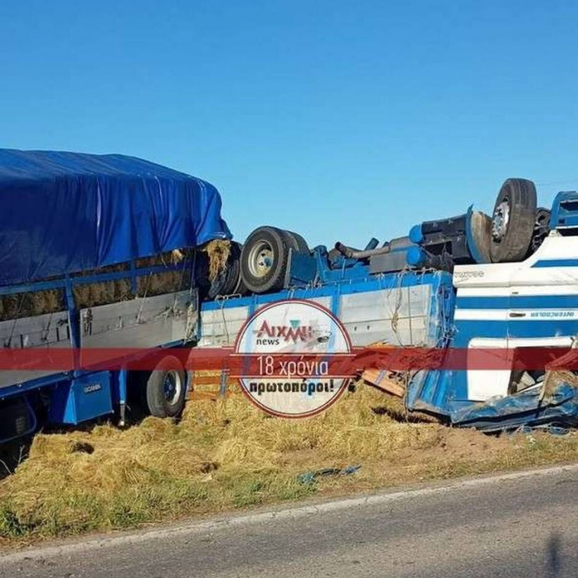 Σύμφωνα με την «Αιχμή», ο οδηγός του οχήματος το οποίο ήταν φορτωμένο με τριφύλλι, για άγνωστη μέχρι στιγμής αιτία, έχασε τον έλεγχο με αποτέλεσμα να αναποδογυρίσει το ρυμουλκό, το οποίο υπέστη σοβαρές ζημιές.