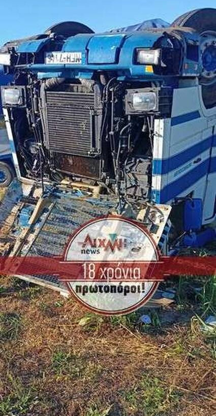 Ο οδηγός έχασε τον έλεγχο με αποτέλεσμα να αναποδογυρίσει το ρυμουλκό Πηγή: aixmi-news.gr