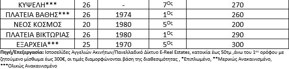 Το μεγαλύτερο μέρος οικονομικών κατοικιών με ζητούμενο μίσθωμα έως 300€, διατίθενται σε περιοχές όπως τα Κάτω Πατήσια, τη Πλατεία Βικτωρίας, την Πλατεία Αττικής, το Γκύζη, τη Κυψέλη και το Κολωνό. Ελάχιστες κατοικίες με ζητούμενο μίσθωμα έως 300€, διατίθενται σε Εξάρχεια ή/και Ν. Κόσμο. Θα μπορούσαμε να αναφέρουμε ότι πρόκειται για «τζόκερ», ιδιαίτερα αν το διαμέρισμα είναι μερικώς ή/και ολικώς ανακαινισμένο.