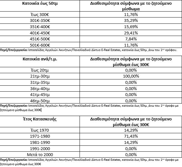 Παράλληλα ανέφερε πως «το 53,06% των διαθέσιμων κατοικιών με ζητούμενο μίσθωμα έως 300€, είναι κυρίως γκαρσονιέρες από 21τμ έως 30τμ, κατοικίες που ως επί των πλείστων είναι κατασκευής 1970-1980».