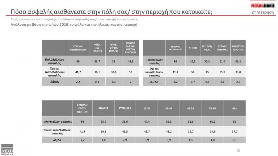 Υπάρχει βέβαια και ένα ποσοστό 41,7% που συγκεκριμένα δηλώνει όχι και τόσο ασφαλής (29,4%) ή και καθόλου ασφαλής (12,3%). Μεγαλύτερη ασφάλεια δηλώνουν οι κάτοικοι των ημιαστικών περιοχών (63,3%), αλλά τα ποσοστά είναι ικανοποιητικά και στις αστικές περιοχές (Αθήνα και Θεσσαλονίκη).