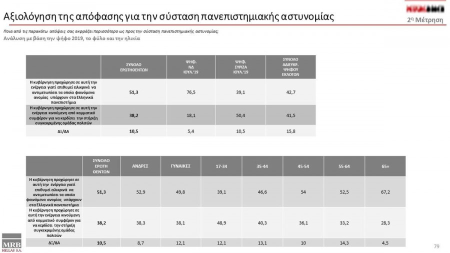 Εξίσου σημαντικό είναι το γεγονός ότι οι πολίτες αναγνωρίζουν στην κυβέρνηση ειλικρινή πρόθεση να λύσει τα προβλήματα της βίας και της ανομίας στα πανεπιστήμια. Σε ποσοστό 51,3% οι ερωτηθέντες αναγνωρίζουν θετική πρόθεση στην κυβέρνηση της ΝΔ . Αντίθετα ένα ποσοστό 38,2% επιμένει ότι η ΝΔ προχωρά στη σύσταση πανεπιστημιακής αστυνομίας μόνο για λόγους ψηφοθηρικούς κινούμενη από κομματικό συμφέρον.