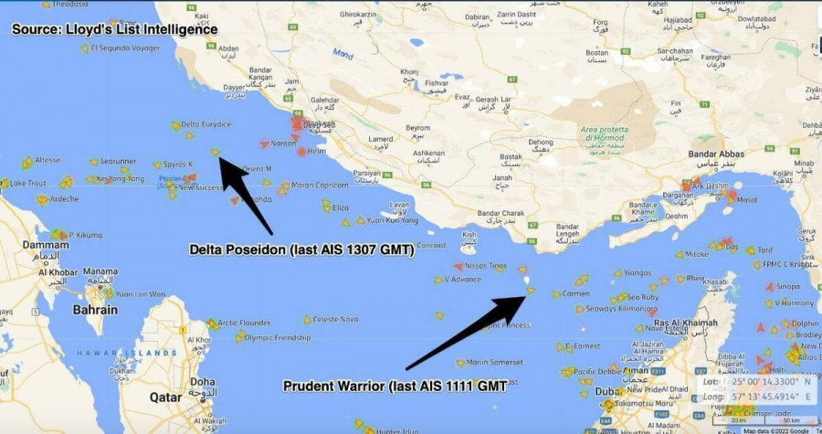 Πρόκειται για τα τάνκερ «Delta Poseidon» και «Prudent Warrior». Το πρώτο φέρεται να είχε πορεία επιστροφής προς την Ελλάδα και το λιμάνι των Αγίων Θεοδώρων, πιθανότατα για να εκφορτώσει στα κοντινά διυλιστήρια, ενώ το δεύτερο φέρεται να είχε πορεία προς τα Ηνωμένα Αραβικά Εμιράτα και το λιμάνι της Φουτζάιρα.