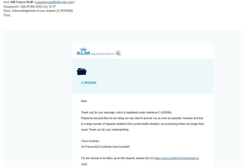 Αξίζει να σημειωθεί πως η κ. Ν.Κ., επιχείρησε να επικοινωνήσει με την εξυπηρέτηση πελατών της KLM, ωστόσο, το μήνυμα που έλαβε ήταν ότι «λόγω φόρτου εργασίας αυτή τη στιγμή δεν μπορούμε να απαντήσουμε»...