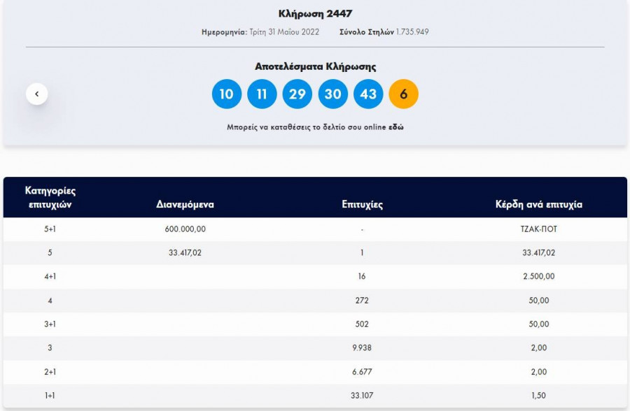 Αξίζει να σημειωθεί ότι στην δεύτερη κατηγορία της αποψινής κλήρωσης αναδείχθηκε ένα επιτυχημένο δελτίο που κερδίζει το ποσό των 33.417.02 ευρώ!