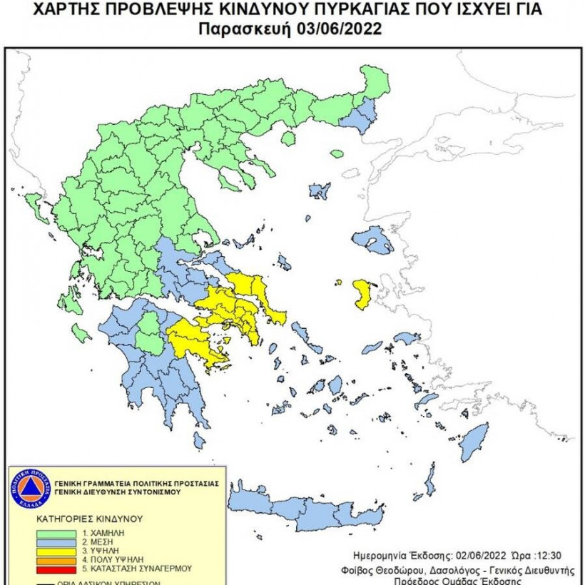 Φωτιές στην Ελλάδα - Όλες οι ειδήσεις: Σύμφωνα με το Χάρτη Πρόβλεψης Κινδύνου Πυρκαγιάς που εκδίδει η Γενική Γραμματεία Πολιτικής Προστασίας του Υπουργείου Εσωτερικών και Διοικητικής Ανασυγκρότησης, για σήμερα Παρασκευή, 3 Ιουνίου, προβλέπεται υψηλός κίνδυνος πυρκαγιάς (κατηγορία κινδύνου 3), σε Αττική, Αργολίδα, περιοχές της Εύβοιας, Βοιωτίας, Κορινθίας, σε Χίο και Ψαρά.