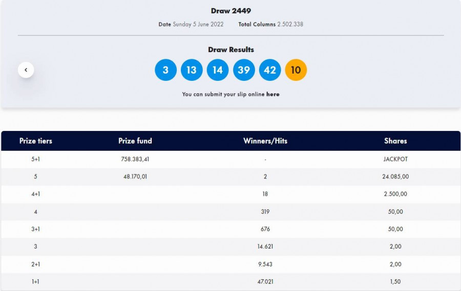 Υπενθυμίζεται ότι οι τυχεροί αριθμοί της περασμένης κλήρωσης του Τζόκερ ήταν οι: 3, 13, 14, 39, 42 και Τζόκερ ο αριθμός 10.