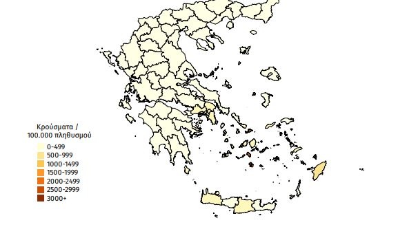 Γεωγραφική διασπορά: Ο χάρτης αποτυπώνει τη γεωγραφική κατανομή των κρουσμάτων COVID-19 των τελευταίων 14 ημερών ανά Περιφερειακή Ενότητα της χώρας, με βάση την δηλωθείσα διεύθυνση μόνιμης κατοικίας του ασθενούς, ή τη διεύθυνση προσωρινής διαμονής για τους τουρίστες και άλλους προσωρινά διαμένοντες στην Ελλάδα. Συμπεριλαμβάνονται τόσο κρούσματα με ιστορικό ταξιδίου όσο και κρούσματα με πιθανή εγχώρια μετάδοση.